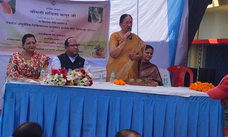 देहरादून । विधायक कैंट सविता कपूर ने बृहस्पतिवार को आयुष्मान आरोग्य मंदिर (आयुष), राजकीय आयुर्वेदिक चिकित्सालय, निरंजनपुर के सौंदर्यकृत भवन का उद्घाटन किया गया। इस अवसर पर विधायक ने कहा कि सरकार आमजन को बेहतर स्वास्थ्य सुविधाएँ उपलब्ध कराने के लिए निरंतर प्रयासरत है। इस मौके पर जिला आयुर्वेदिक एवं यूनानी अधिकारी ने मा0 विधायक को पंचायत भवन में संचालित चिकित्सालय भवन को आयुष विभाग को हस्तांतरित करने का प्रस्ताव भी रखा। इस पर विधायक ने पूर्ण आश्वासन दिया गया।