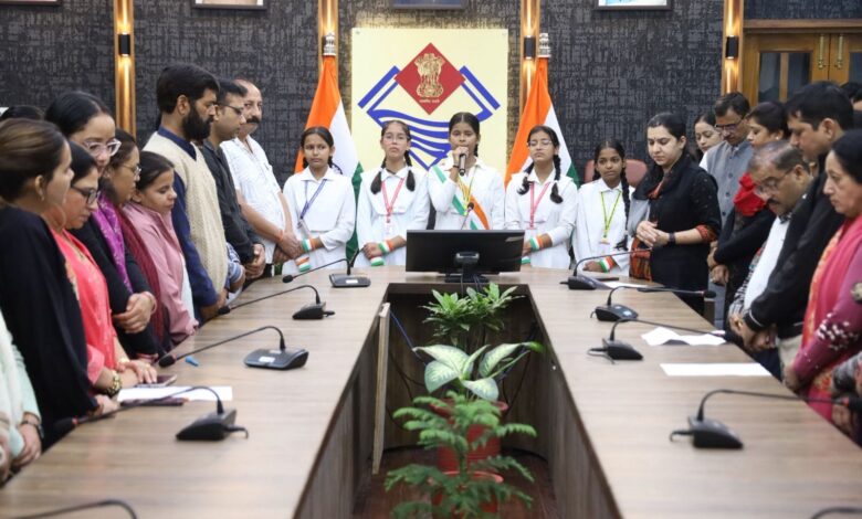 देहरादून: भारत वर्ष के राष्ट्रगीत ‘‘वंदे मातरम्’’ के 150 वर्ष पूर्ण होने के अवसर जनपद के सभी सरकारी, गैर सरकारी कार्यालयों, शिक्षण संस्थानों एवं सामाजिक संगठनों में प्रातः 10 बजे ‘‘वंदे मातरम्’’ का गायन किया गया। जिलाधिकारी सविन बंसल के दिशा निर्देशन में जिला कार्यालय में उप जिलाधिकारी अपूर्वा सिंह की मौजूदगी में क्लेक्ट्रेट परिसर के समस्त अधिकारियों, कार्मिकों एवं श्री गोर्वधन सरस्वती विद्या मंदिर की छात्राओं की उपस्थिति में वंदे मातरम् का सामूहिक गायन किया गया। इस मौके पर देशभक्ति से ओत-प्रोत वातावरण में अधिकारीगण, कार्मिक, शिक्षक, विद्यार्थी सभी उत्साहपूर्वक शामिल हुए।
