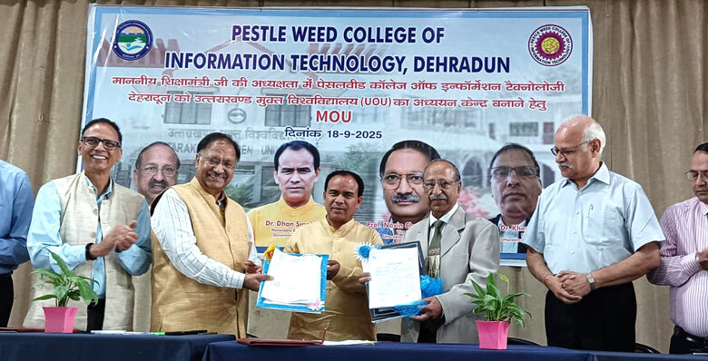 देहरादून। पेसल वीड कॉलेज ऑफ इन्फॉरमेशन टैक्नोलोजी, देहरादून में उत्तराखण्ड मुक्त विश्वविद्यालय के अध्ययन केंद्र बनाये जाने के लिए, उत्तराखण्ड के शिक्षा मंत्री डॉ. धन सिंह रावत की उपस्थिति में, उत्तराखण्ड मुक्त विश्वविद्यालय के कुलपति डॉ. नवीन चन्द्र लोहानी एवं रजिस्ट्रार डॉ. खेमराज भट्ट तथा पेसल वीड कॉलेज के अध्यक्ष डॉ. प्रेम कश्यप ने समझौता ज्ञापन पर हस्ताक्षर किए। इस कार्यक्रम के शुभारम्भ में शिक्षा मंत्री डॉ. धन सिंह रावत, कुलपति (यू.ओ.यू.) डॉ. नवीन चन्द्र लोहानी, कुलसचिव (यू.ओ.यू.) डॉ. खेमराज भट्ट, पेसल वीड कॉलेज के अध्यक्ष डॉ. प्रेम कश्यप, सचिव आकाश कश्यप, प्रबन्धन समिति के सदस्य विनोद शर्मा तथा मेजर जनरल शम्मी सबरवाल, किरन कश्यप, राशि कश्यप तथा पेसल वीड कॉलेज की प्राचार्या डॉ. अनिता वर्मा जी के द्वारा दीप प्रज्वलन से किया गया। तत्पश्चात छात्रों द्वारा रंगारंग कार्यक्रम की प्रस्तुति की गयी। सभी अतिथिगणों को महाविद्यालय की प्राचार्या डॉ. अनिता वर्मा द्वारा पुष्पगुच्छ एवं शॉल प्रदान कर स्वागत किया गया।