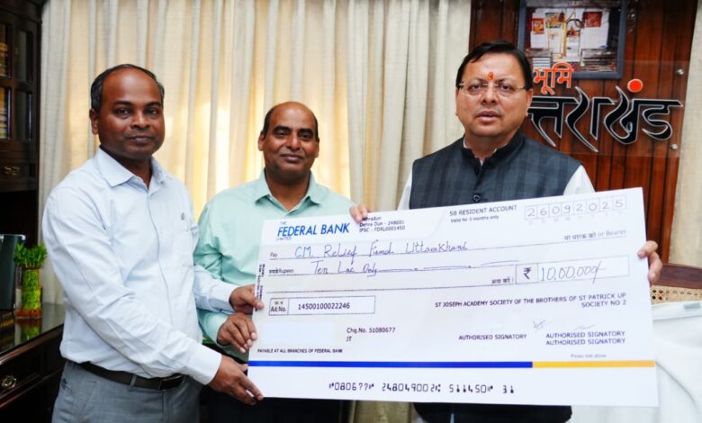मुख्यमंत्री धामी से सेंट जोसेफ अकादमी, देहरादून के स्कूल प्रबंधन ने मुलाकात कर, मुख्यमंत्री राहत कोष में 10 लाख की धनराशि प्रदान की